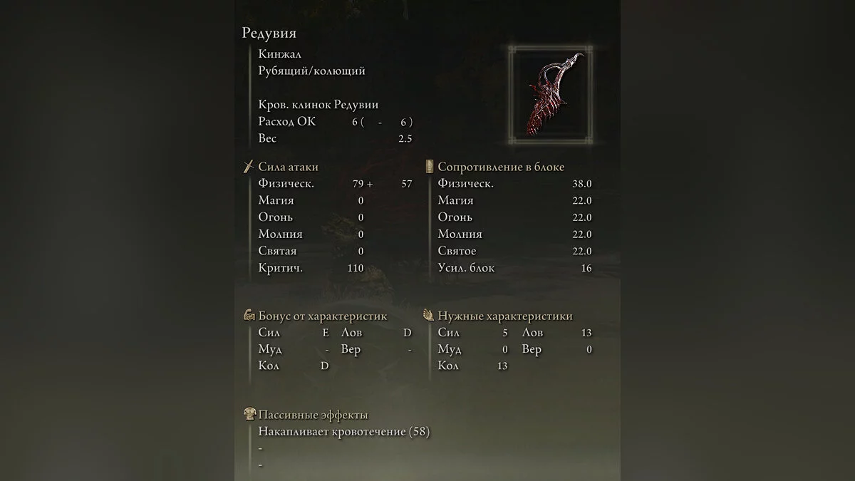 Одним из лучших образцов оружия данного класса станет кинжал Редувия, получить который можно победив Нериджуса, Окровавленного пальца. Найти его можно в ущелье севернее Сожжённых руин, местоположение противника указано на карте выше. Редувия получает бонус от характеристик силы, ловкости и колдовства, а также имеет встроенный навык «Кровавый клинок», который позволяет стрелять снарядами, и пассивно накапливает эффект кровотечения.