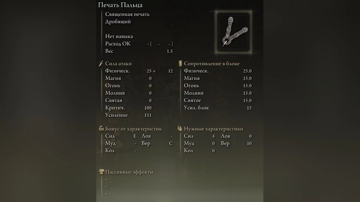 Классы «Исповедник» и «Пророк» начинают игру с Печатью пальца, которую также можно купить служанок в Крепости Круглого стола за 800 рун. Эта священная печать получает бонусы от силы и веры героя.