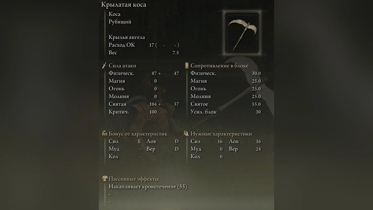 Рекомендуем добыть Крылатую косу в локации «Ведущие к гробнице развалины» на Плачущем полуострове. Эта коса скейлится от силы, ловкости и веры. Навык «Крылья ангела» позволяет подпрыгнуть вверх и нанести мощный рубящий удар. Однако улучшить оружие Пеплом войны невозможно.