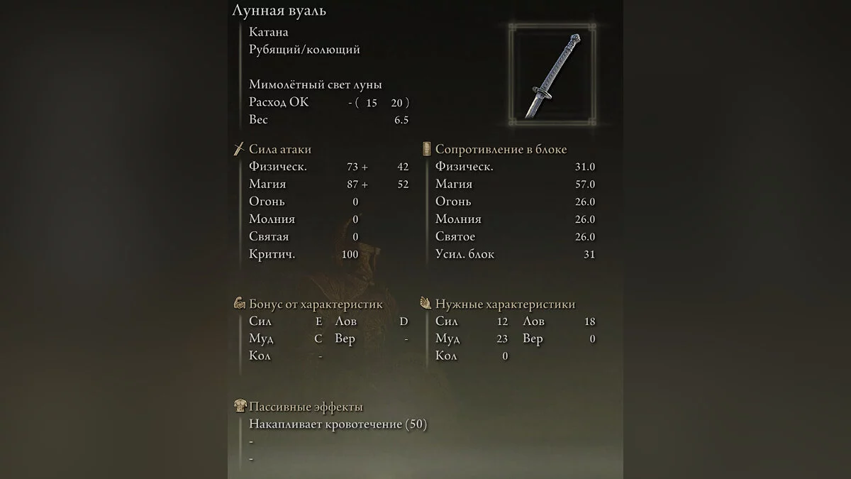 Советуем использовать катану Лунная вуаль, урон которой зависит в первую очередь от силы, ловкости и интеллекта. Сопутствующее ей уникальное умение «Мимолётный свет луны» позволяет герою быстро вытащить оружие, совершить рубящую атаку и выстрелить волной света. Однако Лунную вуаль невозможно усилить Пеплом войны. Катана выпадает с Магмового змея в Туннеле Гаэля, регион Кэлид.