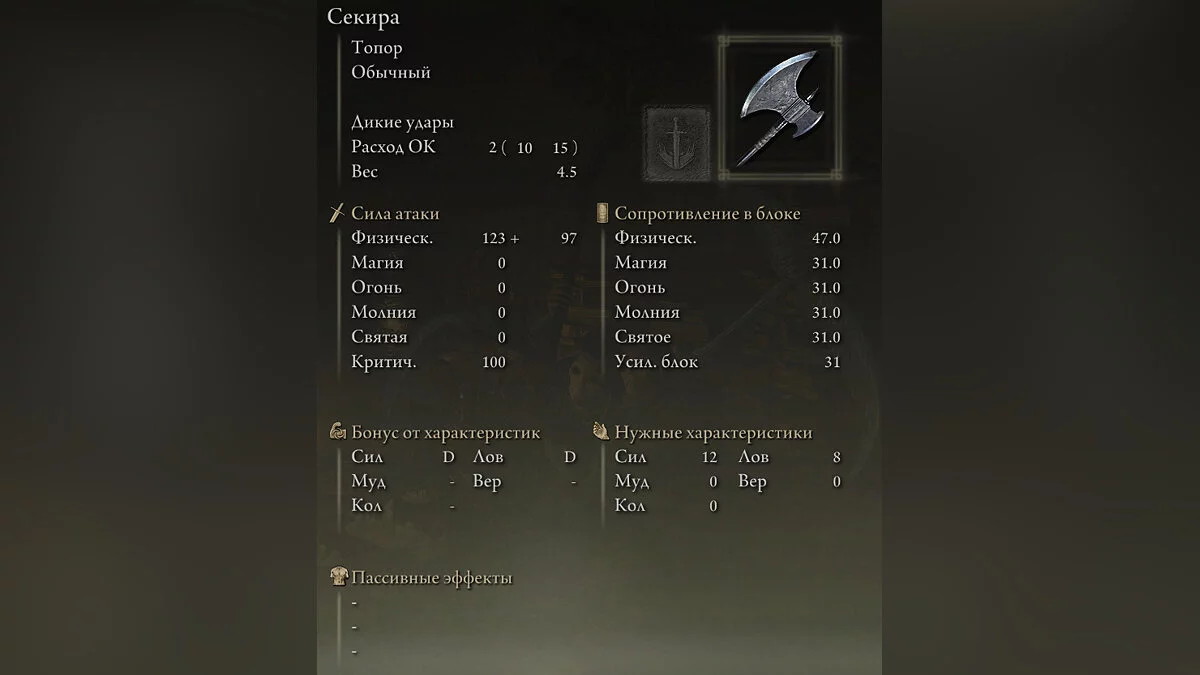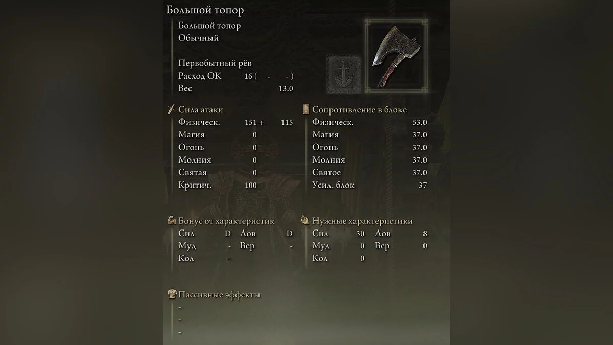 Первый большой топор, который так и называется, вы сможете найти в повозке, которую тянут два великана по дороге мимо места благодати «Разрушенный подвал поселения». Оружие получет бонус от силы, а навык «Первобытный рёв» позволит временно усилить урон и заменит сильную атаку на комбо из трёх ударов.