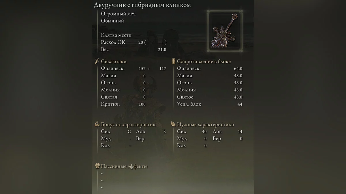 Одним из первых вы можете найти Двуручник с гибридным клинком. Получить его можно после победы над Бастардом Леонином в замке Морн на Плачущем полуострове. Урон этого меча прежде всего зависит от силы Погасшего, ведь для его использования потребуются высокие характеристики.