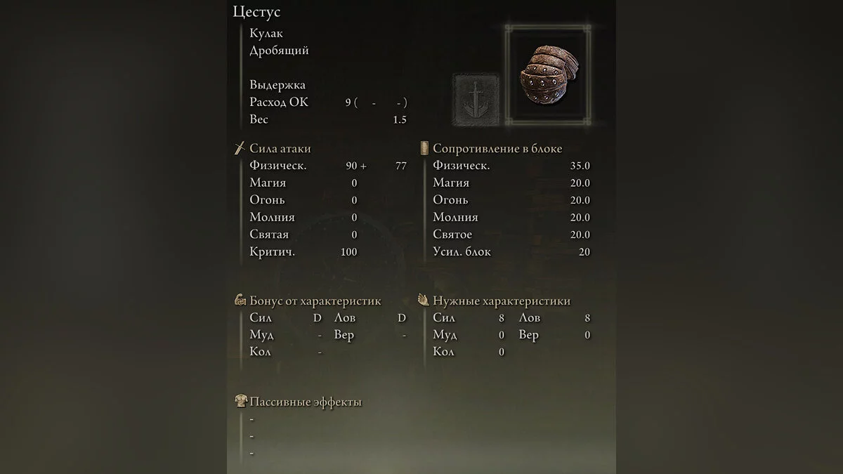 Рекоендуем обратить внимание на Цестус, урон этих кулаков масштабируется от силы и ловкости. Их способность «Выдержка» также даёт дополнительный бонус к защите от повреждений. Если персонаж сохранил жизнь привратнику Гостоку в Замке Грозовой Завесы, то это оружие можно купить у него. Если нет — у служанок в Крепости Круглого стола, нужно лишь отдать им колокольную сферу убитого NPC. Пепел войны не накладывается на Цестус.