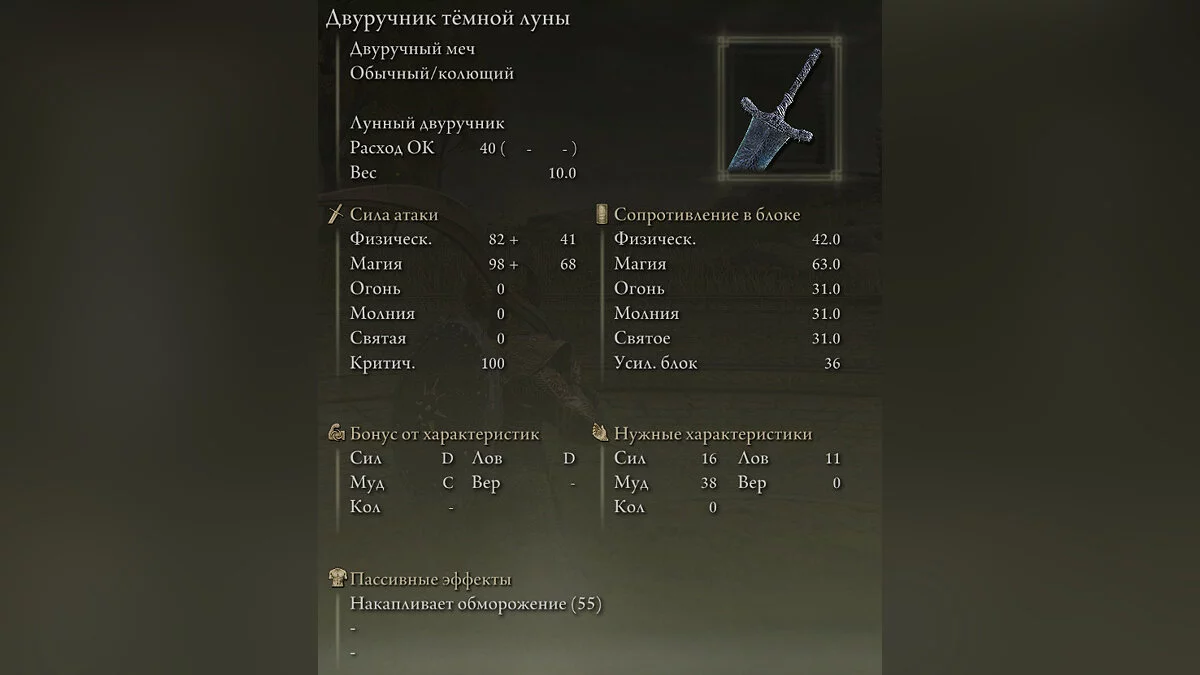 Для знакомства с этим классом оружия мы рекомендуем легендарный Двуручник Тёмной Луны, как его найти мы рассказали в этом руководстве. Он получает дополнительный урон от силы, ловкости, мудрости героя. Особый навык «Лунный двуручник» временно усиливает магические атаки и поражает врагов световыми волнами. Двуручник Тёмной Луны не усиливается Пеплом войны.