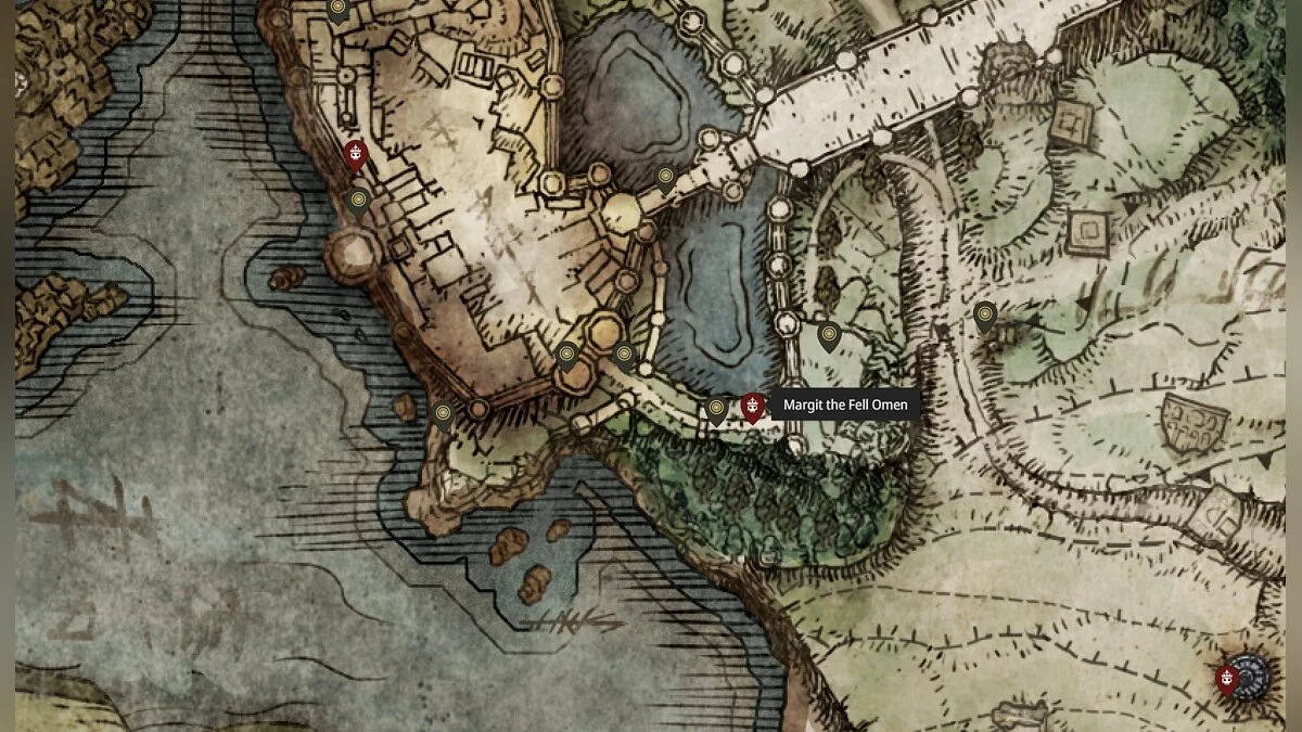 От места благодати «Лачуга на Грозовом холме» поднимаемся в крепость по северо-западной дороге и встречаемся с первым сюжетным врагом в игре. На первой фазе противник использует вертикальный удар посохом с последующей атакой мечом, короткий прыжок назад с броском нескольких кинжалов, наскок на игрока, быстрый удар хвостом и двойную атаку посохами. Во второй фазе Маргит начинает использовать длинный меч и молот. Противник комбинирует удары с посохами, а урон от мощных атак становится больше.