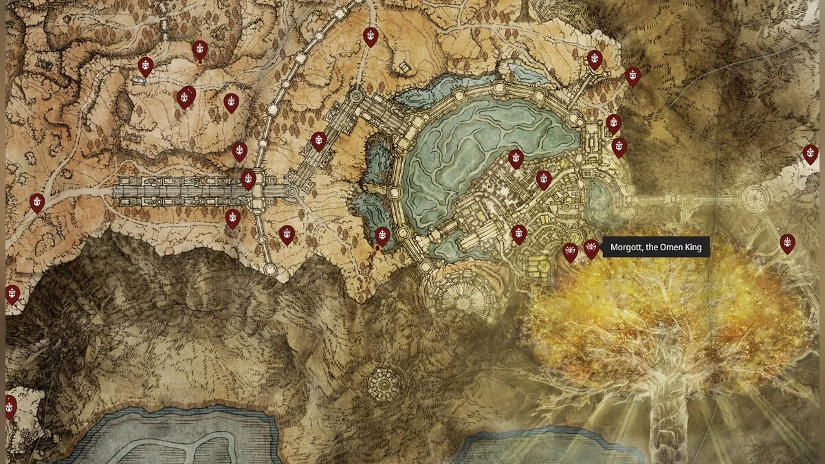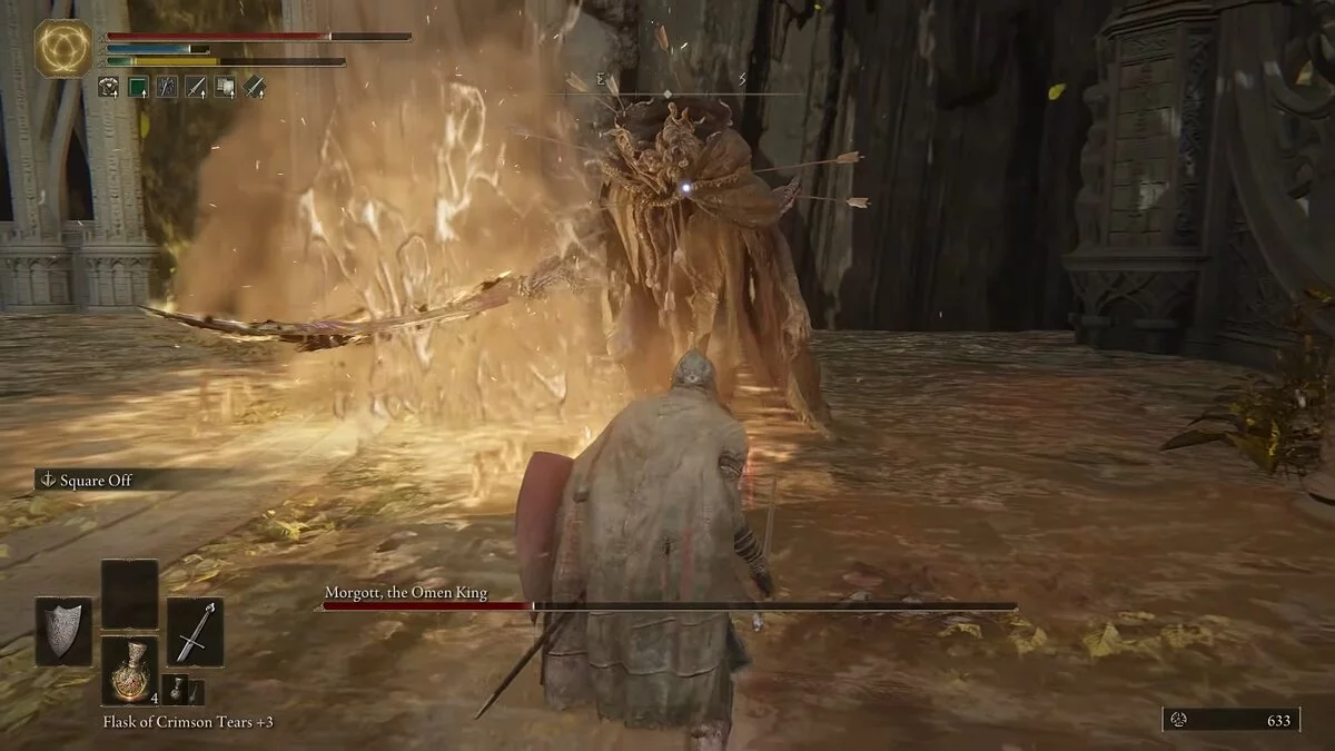 Поднимаемся ещё выше к арене у золотого дерева для встречи с боссом. Чаще всего противник использует комбинации из размашистых ударов, броски копий и кинжалов. При падении на колени Морготт заряжает круговой выброс энергии, который нанесёт много урона игроку. Во второй фазе противник часто применяет атаку кинжалами по площади и удары молотом.