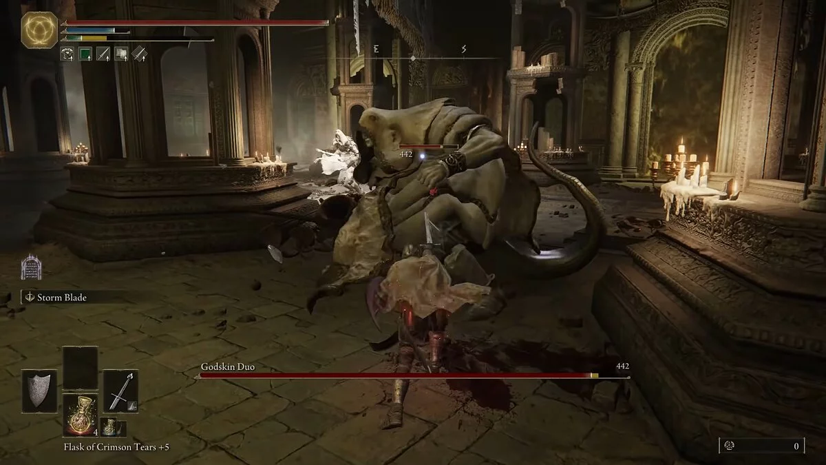 В этом бою пригодится дальнобойный Пепел войны. Его можно использовать через колонны. Рекомендуется как можно чаще убегать от врагов и прятаться за столбами. Враги очень быстрые и используют много сильных атак. В первую очередь желательно избавиться от толстого противника. Если он катится на героя, то необходимо прятаться за колоннами или использовать одну из разрушенных колонн в качестве платформы. Также этот враг часто атакует размашистыми и колкими ударами.