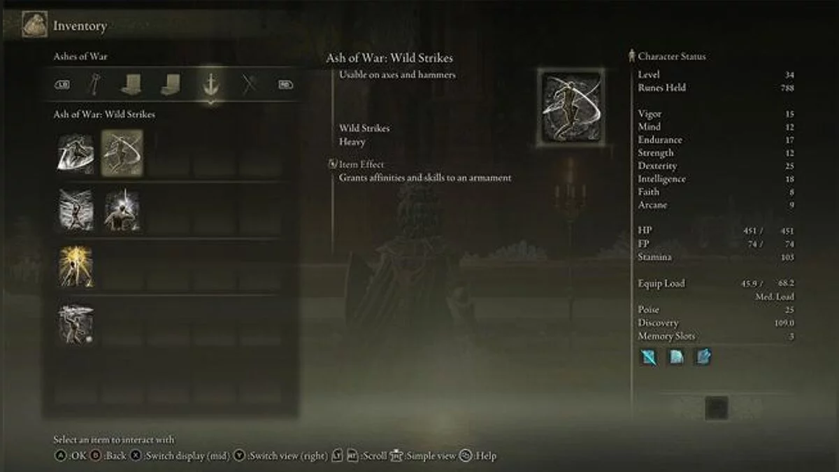 Изучая свойства большинства «обычных» пеплов войны вы увидите влияние на шкалу основных характеристик, таких как сила и ловкость. Однако есть и другие навыки с более экзотическими свойствами: огонь, молния, магия и даже кровь. Обычные специальные удары связаны с техникой ведения боя, например, подбросить противника или ворваться в толпу. Более редкий пепел позволит выстрелить метательным лезвием из крови или наделить меч магией.