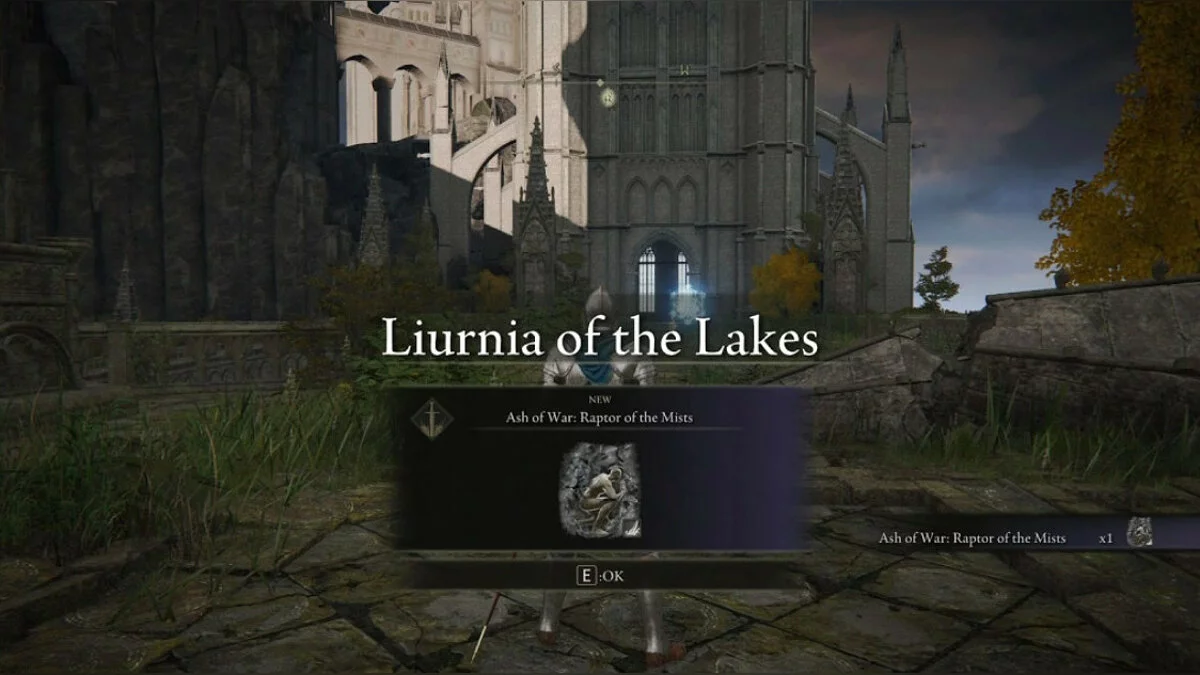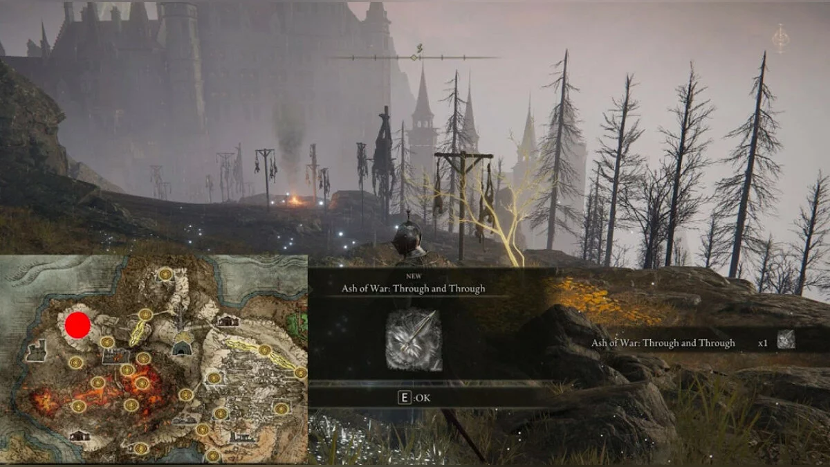 Там найдется точильный нож, позволяющий устанавливать навыки на оружие, а также первый пепел — Грозовой топот. Теперь отдыхая в местах благодати вы увидите отдельное меню «Пепел войны», где можно привязать любой из найденных скиллов к подходящему мечу.