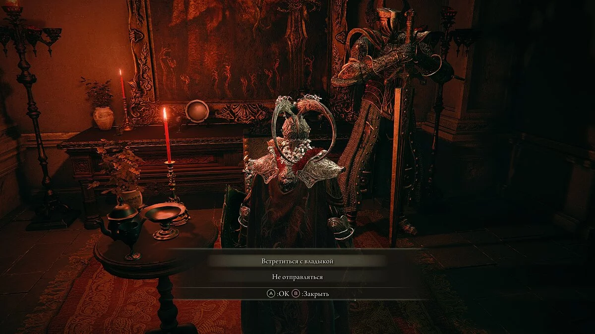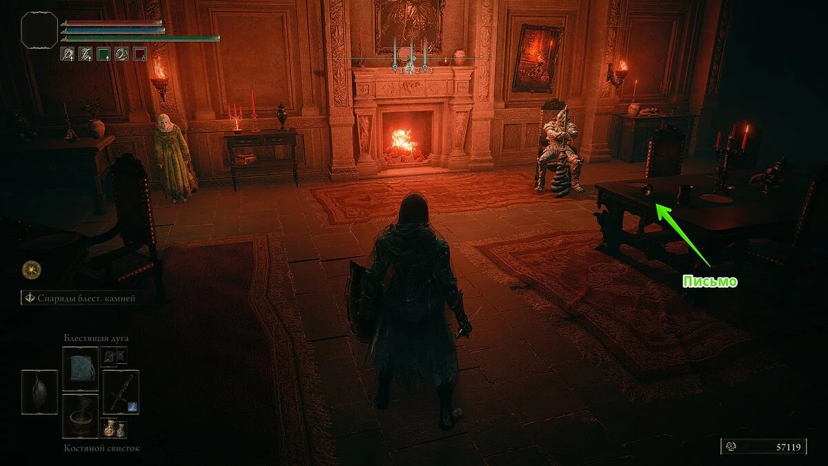 Активируйте место благодати и поговорите с хозяйкой поместья. Женщина предложит вам присоединиться к ней. Если ответите согласием, то получите ключ от гостиной. При помощи этого ключа откройте дверь в большую комнату и прочтите письмо на столе. Когда письмо будет у вас, поговорите с двумя персонажами.