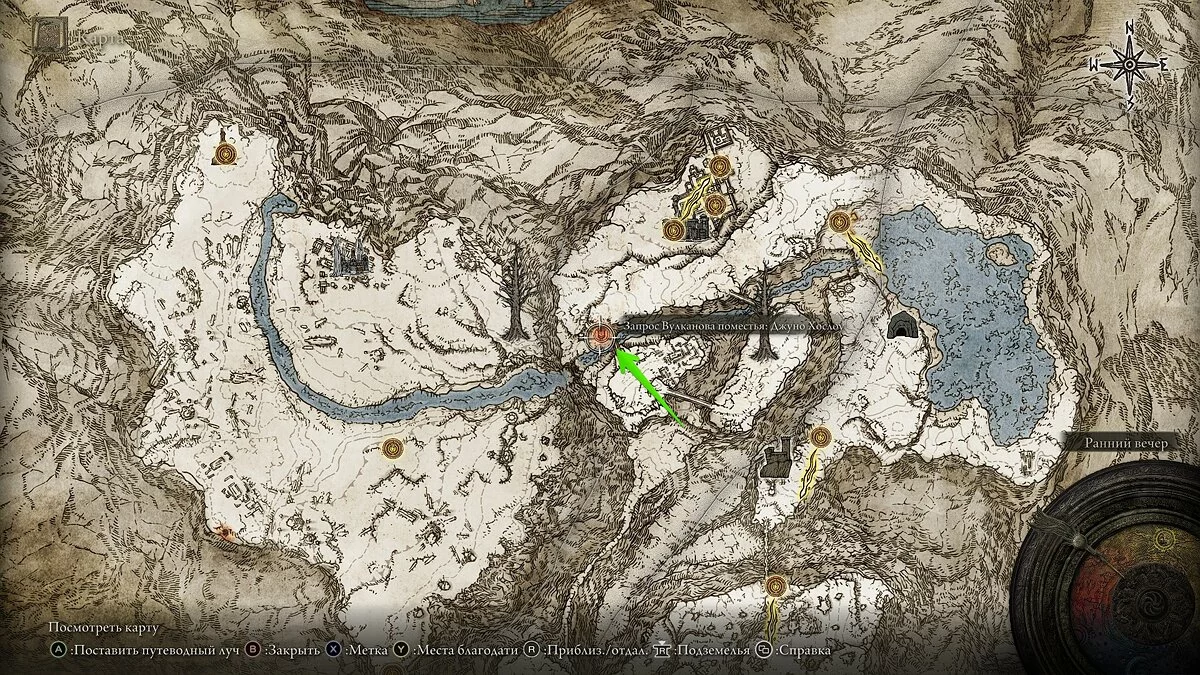 Используйте быстрое перемещение к «лачуге на Грозовом холме» или к «лачуге воителя», и следуйте по дороге к отмеченной на карте локации. Здесь на земле вы увидите красное свечение — взаимодействуйте с ним. Так вы окажетесь в мире старого рыцаря Иствана.