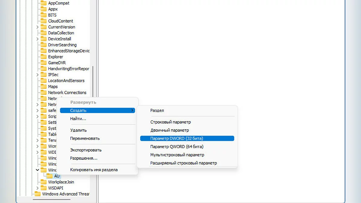 - В разделе «AU» нажмите «Создать» и выберите «Параметр DWORD (32 бита)».