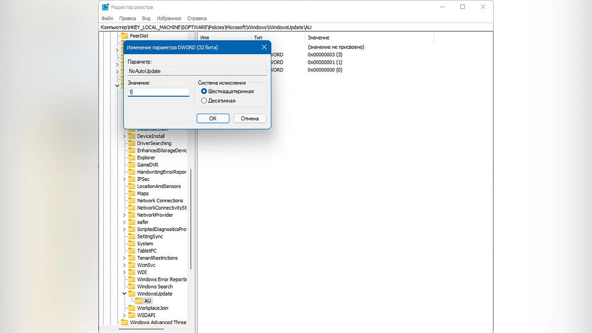 - Дважды щёлкните «NoAutoUpdate», измените значение данных на 1 и нажмите «ОК».