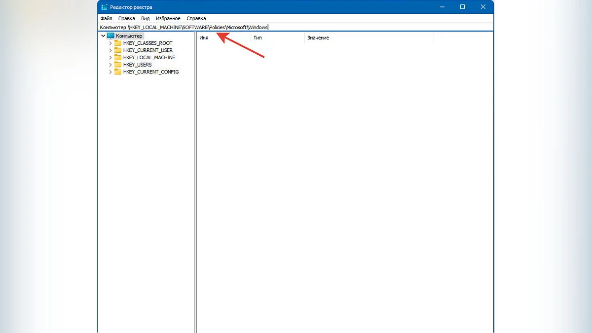 - Скопируйте путь «Компьютер\HKEY_LOCAL_MACHINE\SOFTWARE\Policies\Microsoft\Windows» без кавычек, вставьте его в адресную строку реестра и нажмите Enter.