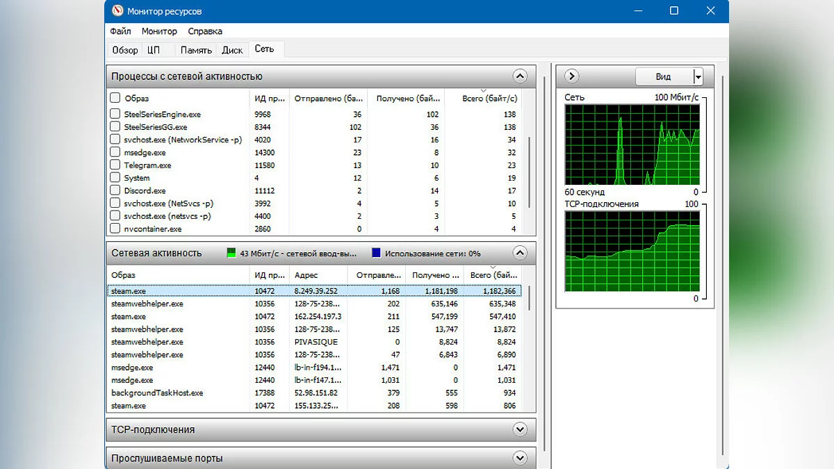 Как видно на скриншоте, самый ресурсоёмкий процесс — это Steam. Таким же способом вы сможете найти любой процесс, использующий Интернет-соединение по максимуму.