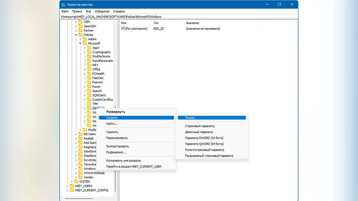 - Щёлкните правой кнопкой мыши на папке Windows, выберите в списке «Создать», затем «Раздел».