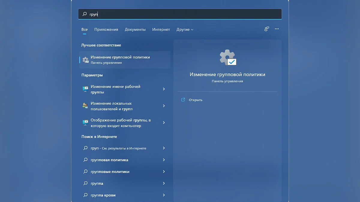 - Нажмите клавишу Windows и с помощью строки поиска откройте меню «Изменение групповой политики». Редактор групповой политики доступен только для пользователей версий Windows Pro и Enterprise.