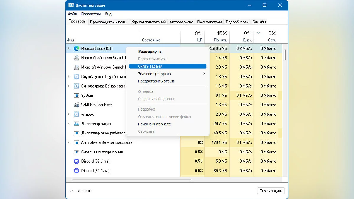 - Откройте «Диспетчер задач» и выберите вкладку «Процессы».