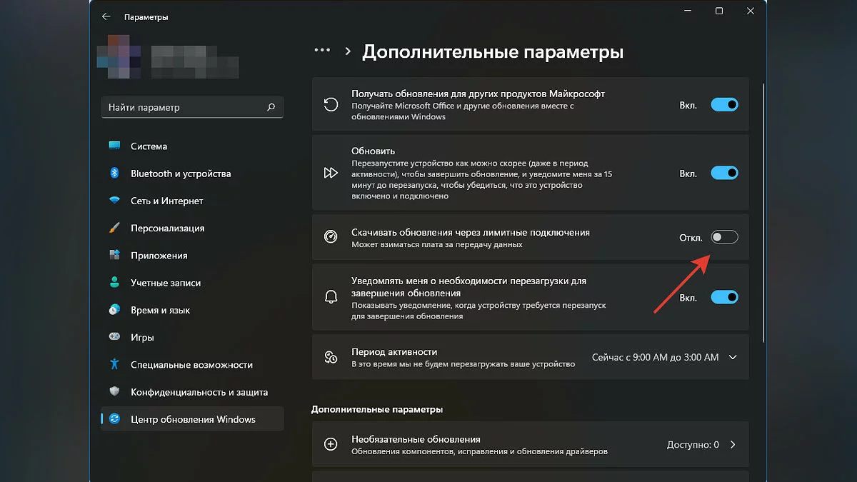 - Отключите параметр «Скачивать обновления через лимитные подключения».