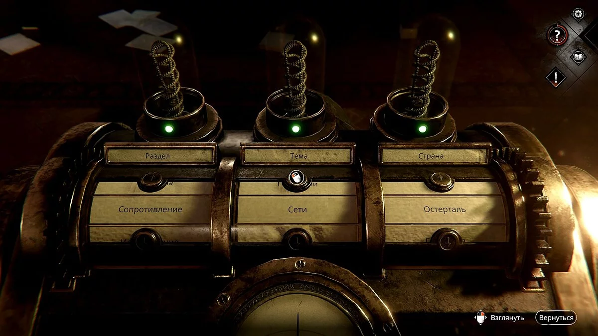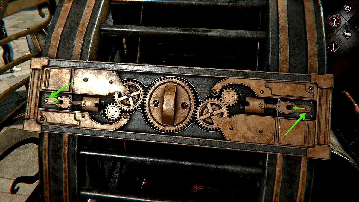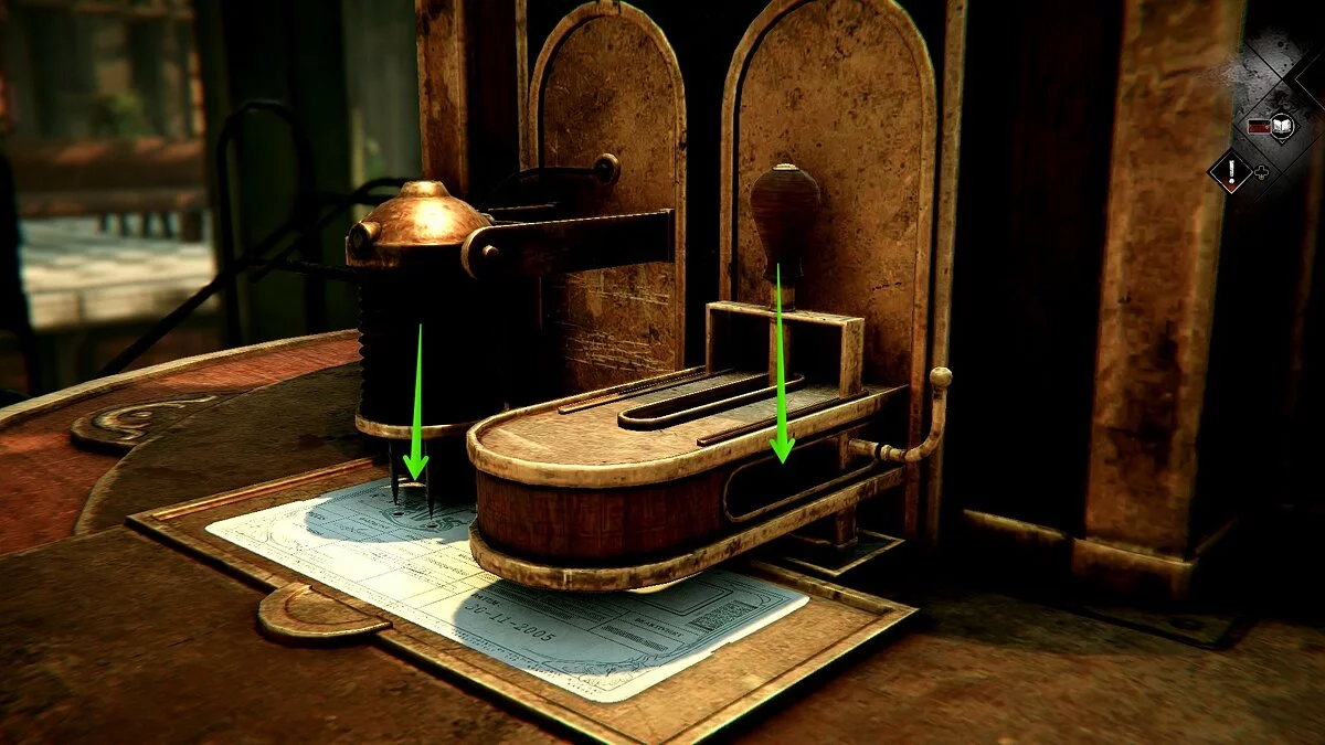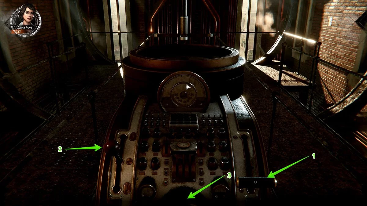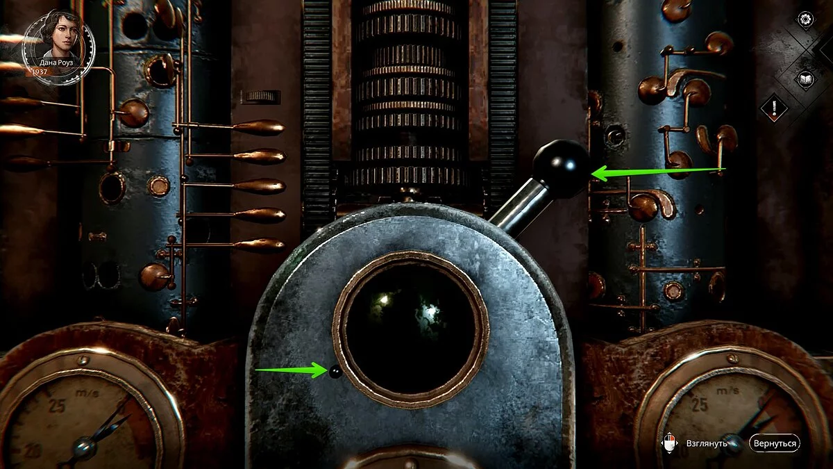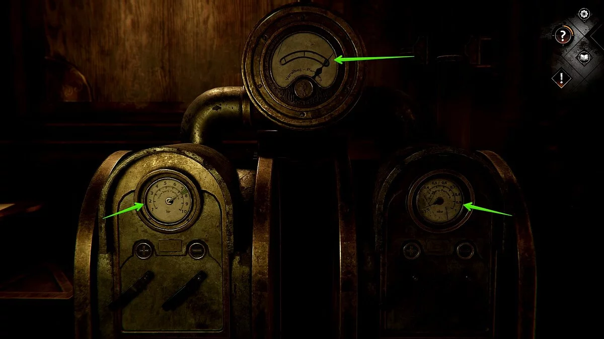 После разговора с Юнтой нужно подготовить телеграф к работе. Для этого взаимодействуйте с механизмом в левой части комнаты. Поднимите давление в левой камере и опустите в правой. Когда боковая панель откроется, покрутите ручку по часовой стрелке несколько раз.