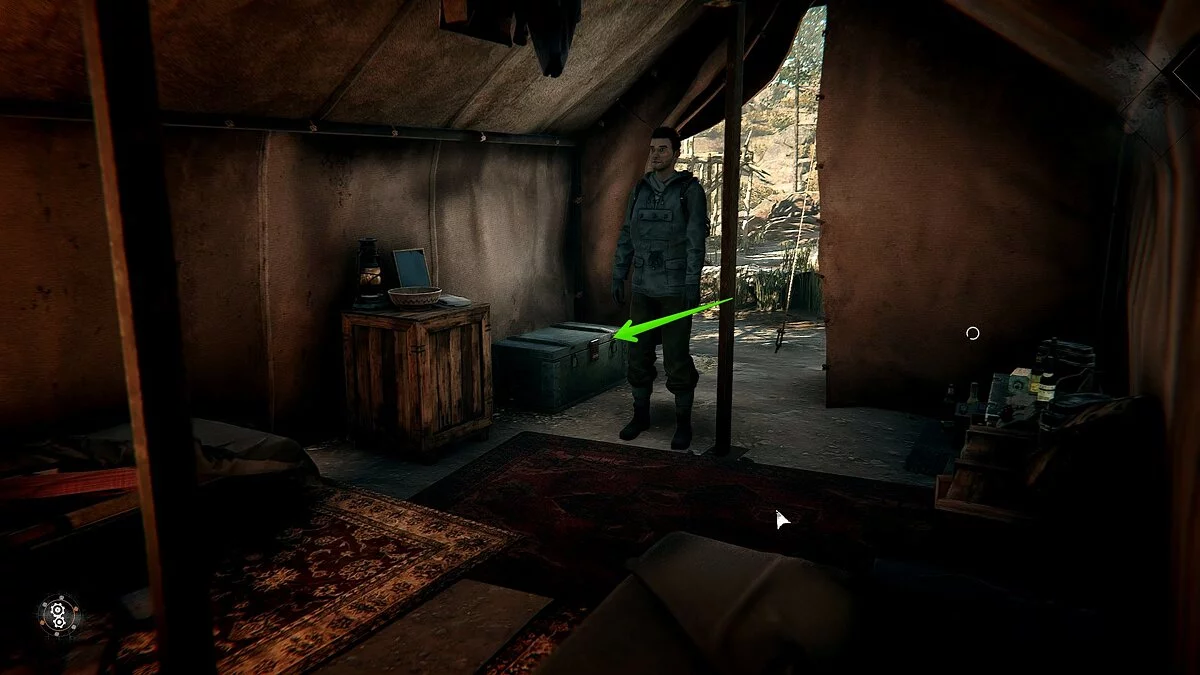 Теперь вы играете за Леона. Осмотрите свой шатёр,соберите все предметы и рюкзак. На улице наберите воды из бочки — получите достижение «Быть подготовленной». Осмотрите карманные часы Бауэра и запомните дату рождения дочери. Войдите во вторую палатку и откройте сундук при помощи комбинации «0408».