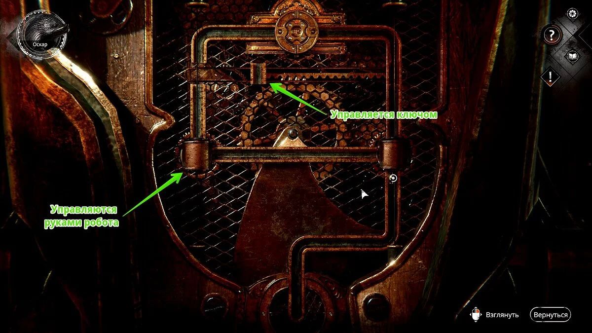 Снова переключитесь на Оскара и опустите тело робота ещё ниже. Вы откроете доступ к потайному замку. Шарик нельзя передвигать там, где находятся веса. Управляйте руками автоматона при помощи Оскара, чтобы поднимать или опускать их. Ключом же регулируйте трубки.