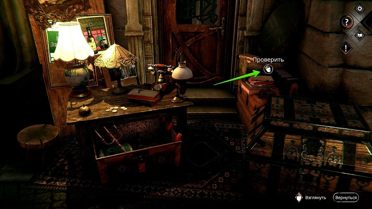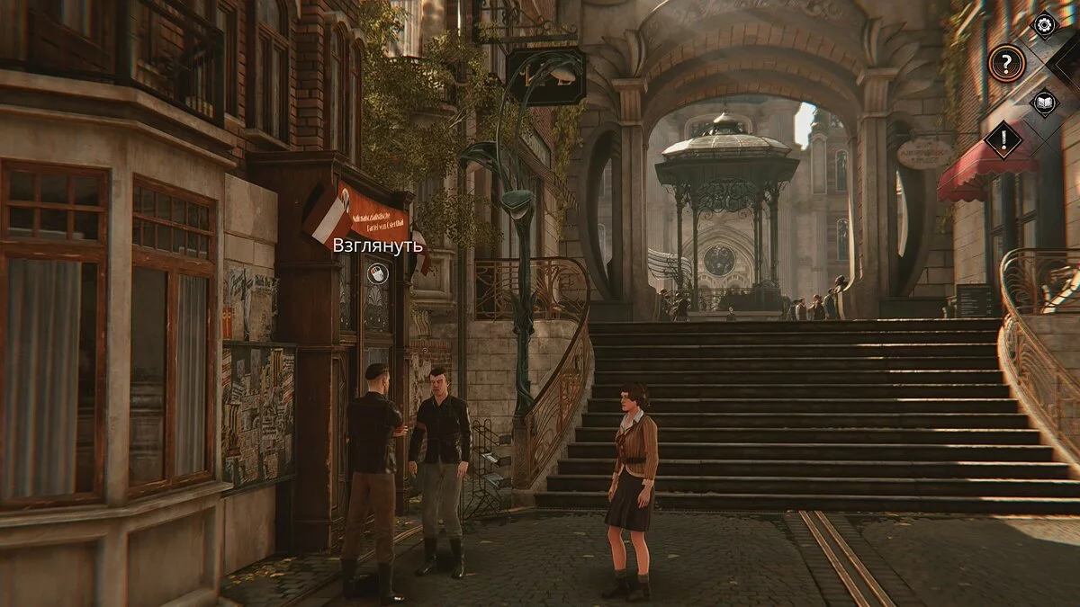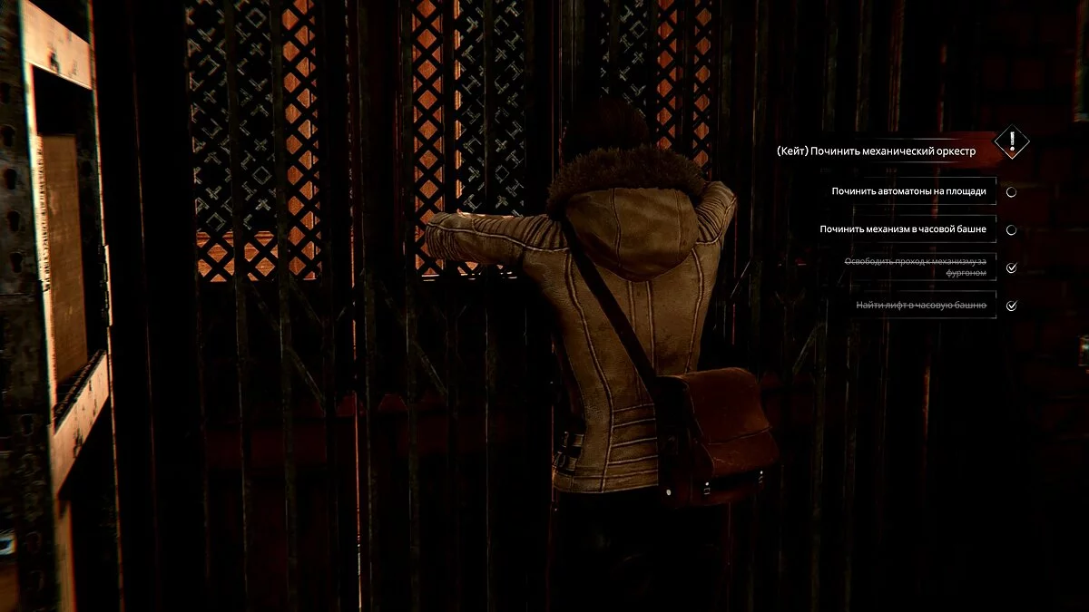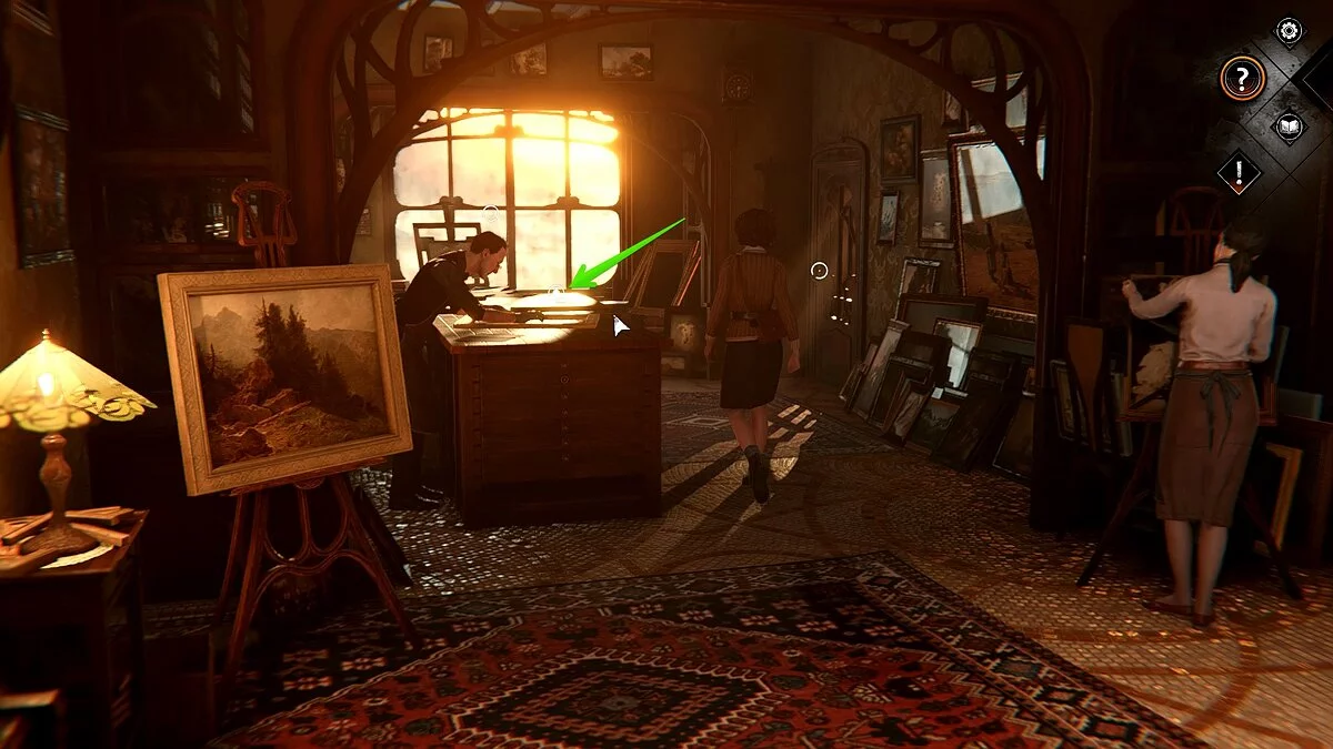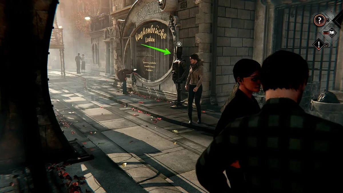 Сперва осмотрите все торговые палатки, чтобы завершить побочную задачу. Добравшись до лавки Мюллера, взаимодействуйте со звонком три раза. Покажите мужчине картину, которую нашли в поезде. Чуть позже придётся решить головоломку по запуску автоматона.