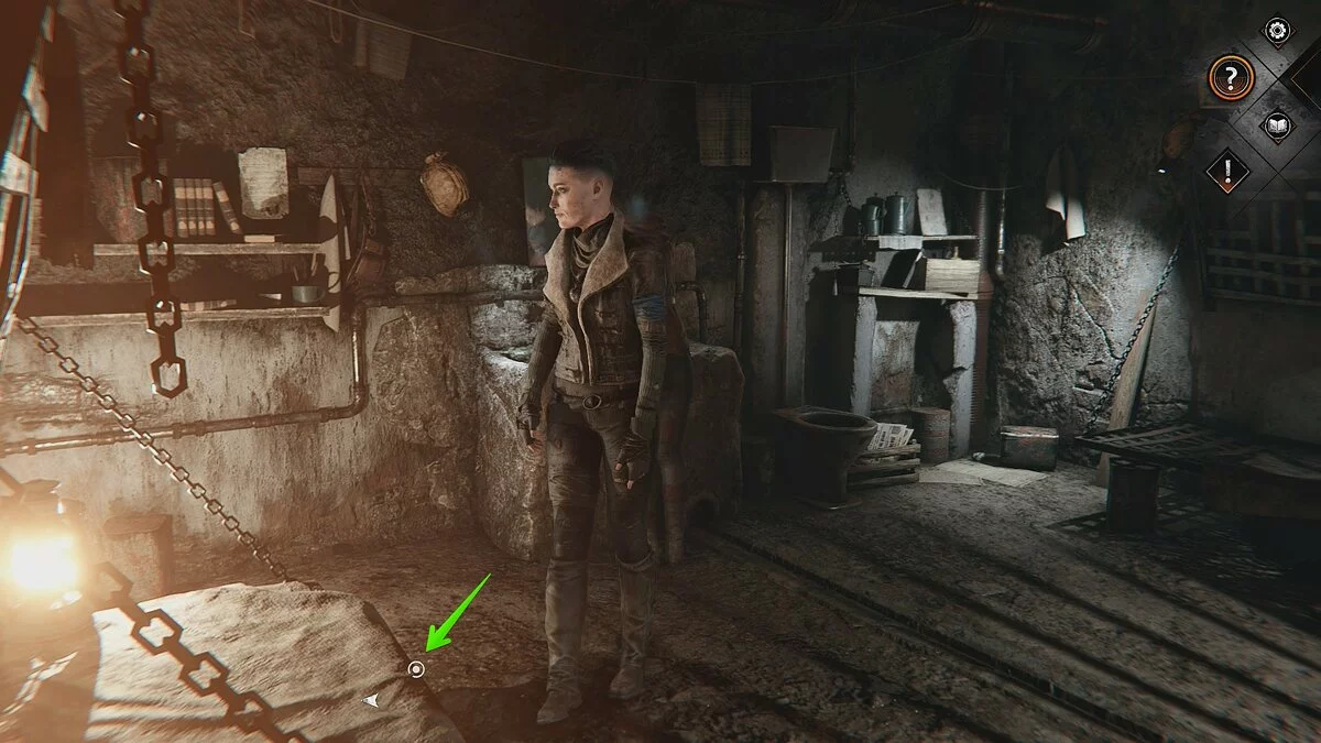 Войдите в здание, пообщайтесь с альпинистом и поднимитесь на второй этаж. Осмотрите подсобку и комнату Лени. Взаимодействуйте с рычагом, чтобы спустить лестницу на чердак.