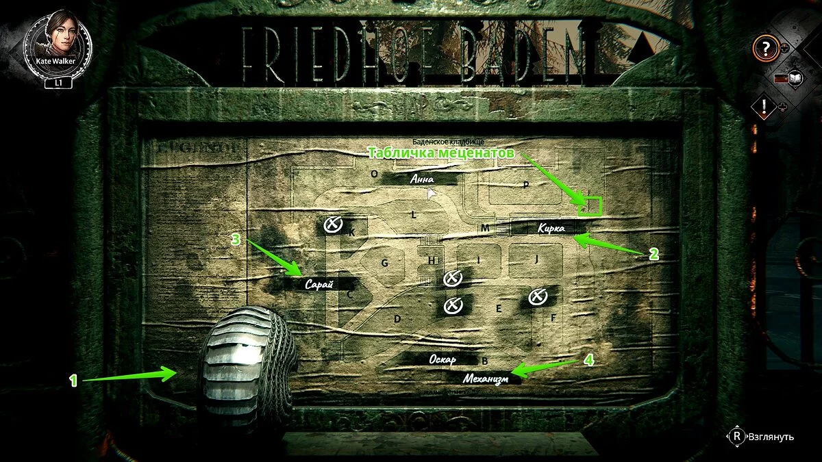После нескольких кат-сцен вы снова вернётесь на кладбище. Отправляйтесь к выходу, чтобы запустить скрипт. Ворота закроются и вам придётся найти способ их открыть. Если вы тщательно исследовали кладбище, то, вероятно, уже знаете что делать. Если найдёте все объекты и тупики, а также табличку меценатов, то получите достижение «Картограф».