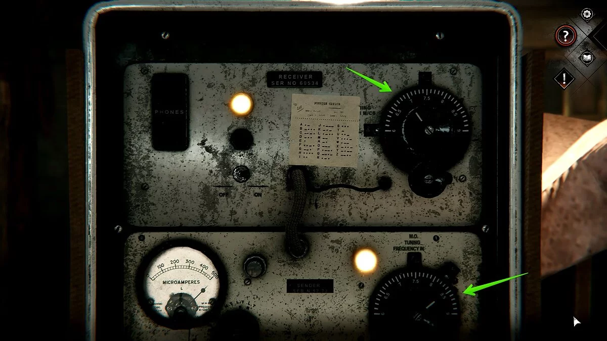 Когда будете готовы, вернитесь в дом и на первом этаже найдите рацию. Осмотрите левый карман чехла, возьмите документы. Теперь вам нужно правильно настроить радиостанцию для связи с Лондоном.