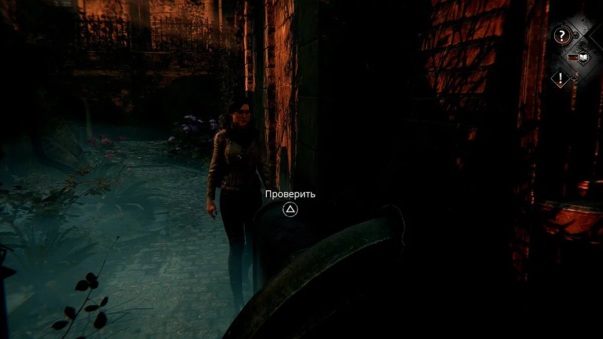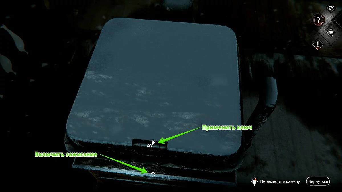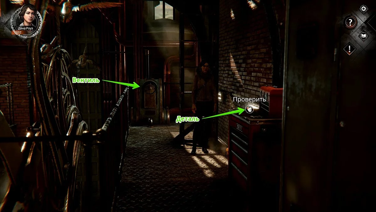 Вернитесь в здание, осмотрите камин. Забросьте полено, затем возьмите ещё одно на улице. Поверните камеру вправо, осмотрите вентиль, который выделен на скриншоте ниже. Снимите его и примените на воздухозаборнике слева.