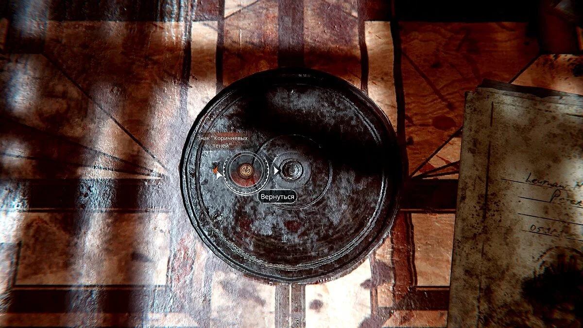 Прочтите документы, отодвиньте руку офицера и нажмите на кнопку в столе. Откроется потайной ящик. Заберите оттуда деревянный диск с фашистской символикой и вставьте его в круглое отверстие в столе. Справа откроется панель с ключами. Перед этим вам нужно взаимодействовать со всеми интерактивными объектами, чтобы завершить побочную задачу «Исследовать поезд».
