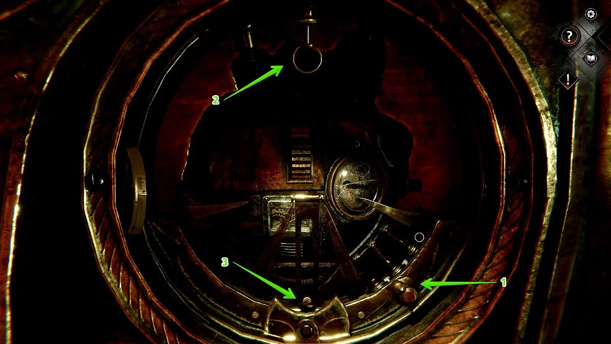 Взгляните на боковые части механизма и взаимодействуйте с небольшими рычагами. Так появятся две кнопки, на которые следует нажать. Теперь нужно ввести правильную комбинацию. Она написана на лицевой стороне автоматона, рядом с логотипом Форальберга — «293670». Последовательно выберите эти цифры, откроется верхняя часть устройства.