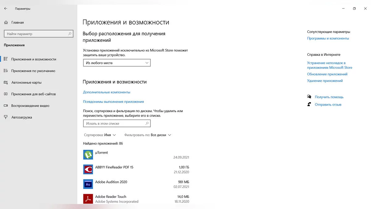 Стоит регулярно проверять компьютер на наличие ненужных программ. Они могут мало весить, зато запускают фоновые процессы, отправляют статистику. Чтобы посмотреть наличие приложений, необходимо правым кликом по кнопке «Пуск» вызвать контекстное меню и выбрать пункт «Приложения и возможности».