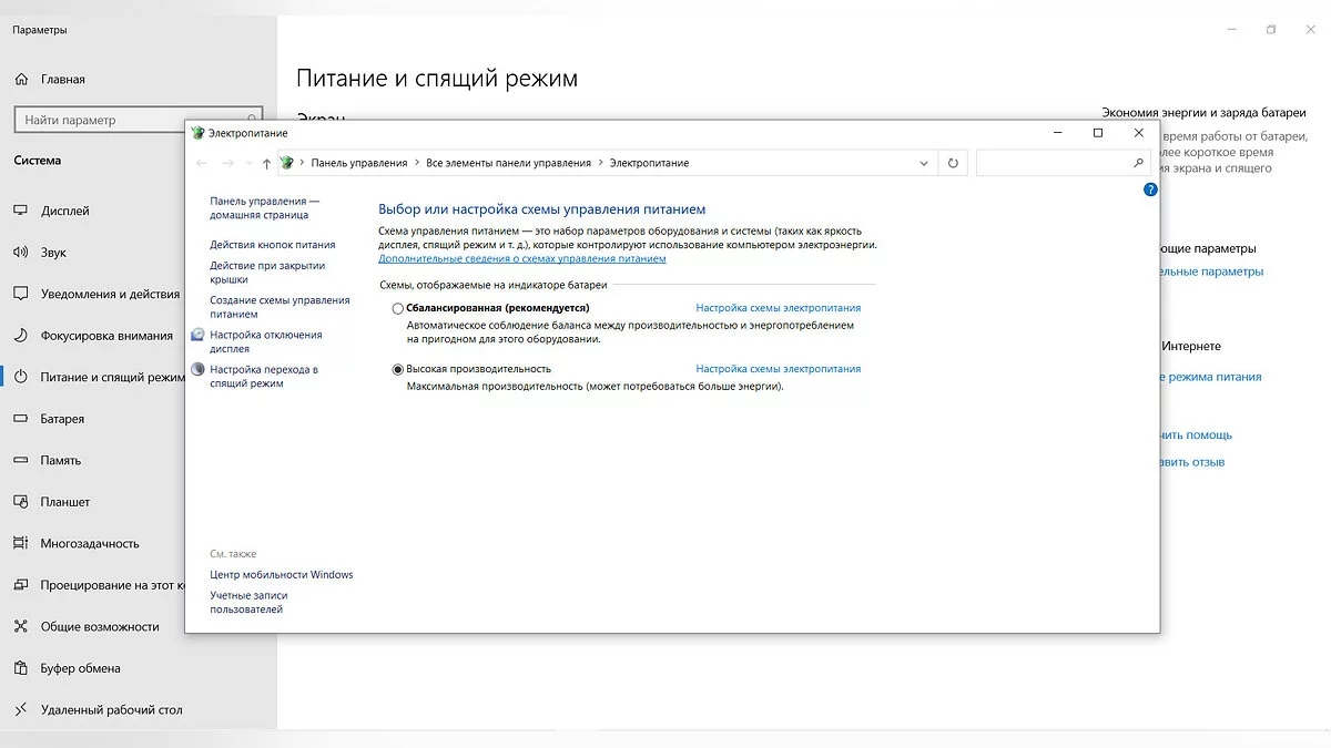 На Windows 10 в окне «Параметры» на вкладке «Питание и спящий режим» есть «Дополнительные параметры питания». Выберете «Высокая производительность».