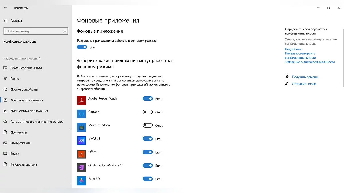 Фоновые процессы всегда влияют на производительность ПК. Чтобы их отключить, откройте меню «Пуск» — «Параметры» — «Конфиденциальность». Найдите внизу вкладку «Фоновые приложения» и уберите все, что не нужно.