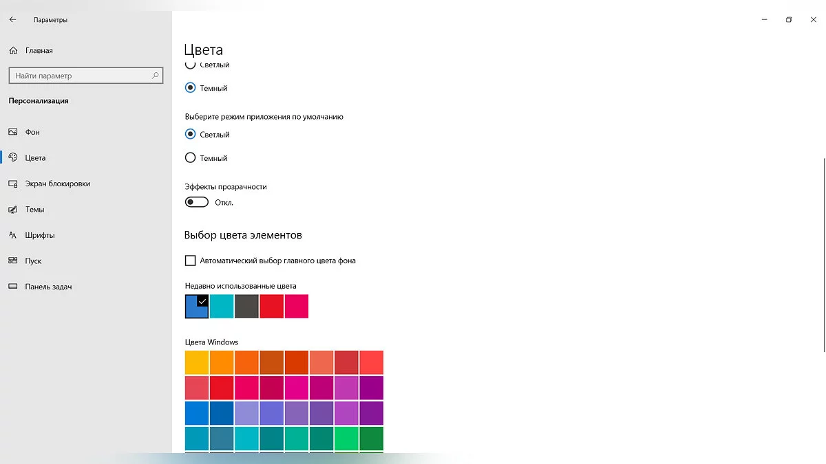 Дополнительно к настройкам выше можно выключить эффекты прозрачности в разделе «Цвета», выбрав «Персонализация».