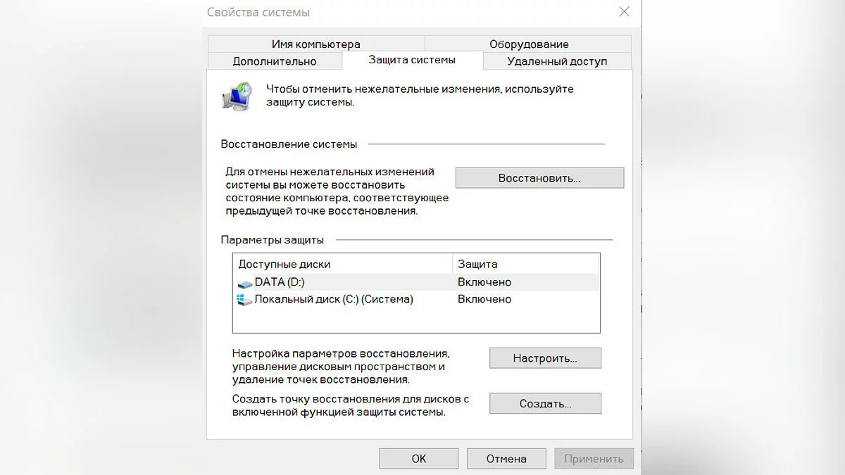 В появившемся окне щелкните по кнопке «Настроить» и выберите «Отключить защиту системы». Здесь же можно удалить и предыдущие точки восстановления, нажав на соответствующую кнопку.