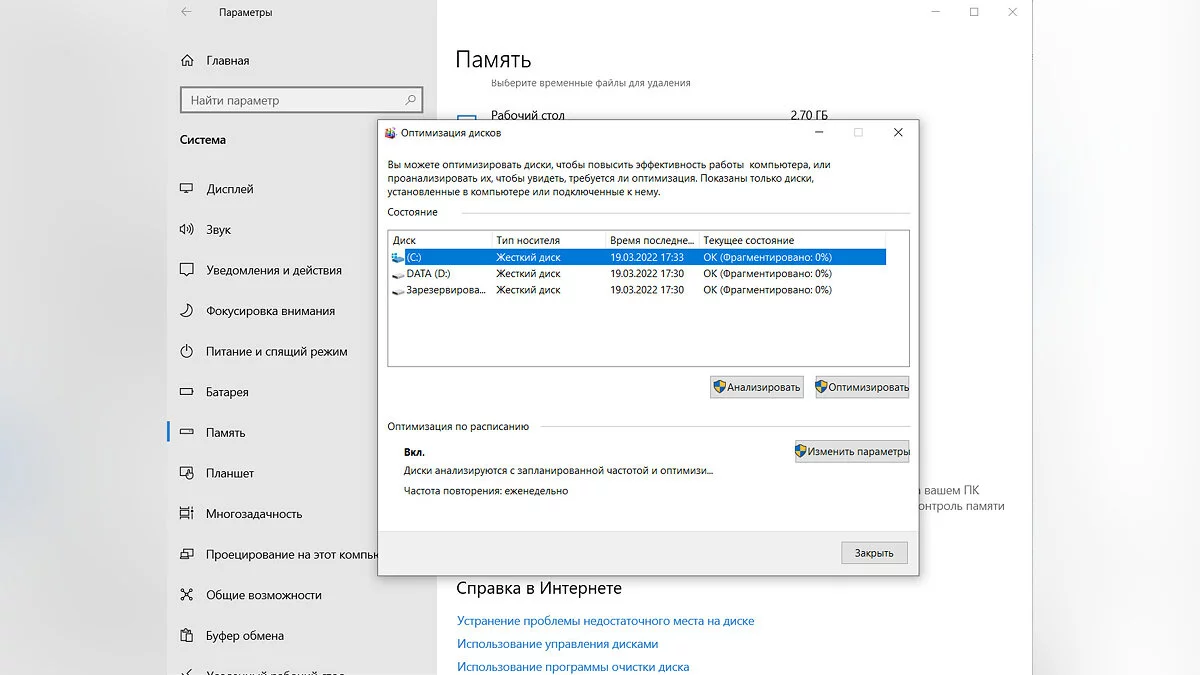 Обычно процесс дефрагментации происходит автоматически и не требует регулирования. Однако иногда стоит проверять настройки. Перейдите к «Система». После этого нажмите на раздел «Память». Выберите «Другие параметры хранилища», а затем «Оптимизация диска».