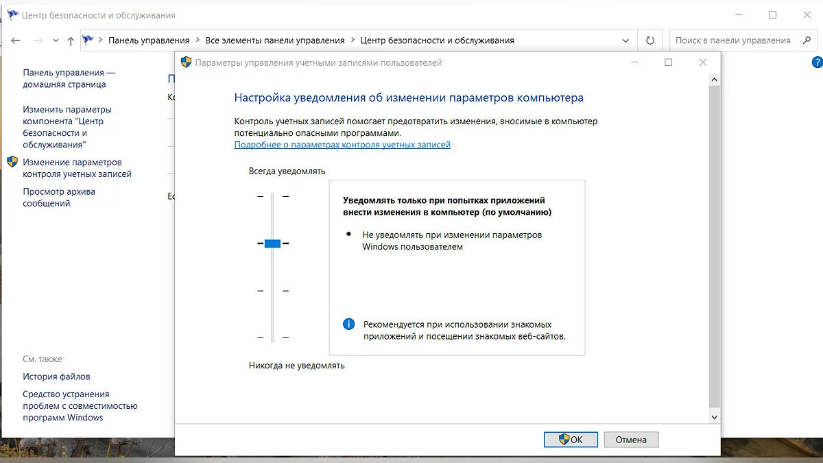 В рамках домашнего использования большинству людей достаточно иметь лишь антивирусное программное обеспечение, а лишние уведомления только отвлекают. Для отключения UAC введите в меню поиска «Панель управления» и далее нажмите «Центр безопасности и обслуживания». Найдите «Изменение параметров контроля учетных записей». Появится окно с ползунком, который необходимо сдвинуть вниз и нажать «Ок».