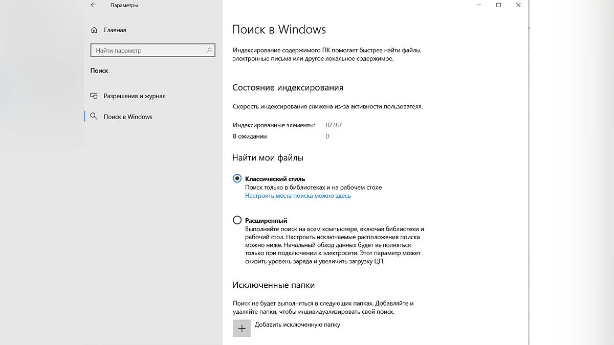 В этом режиме по умолчанию включены папки «Документы», «Изображения», «Музыка», а также файлы и значки на рабочем столе. Вы также можете добавить свои папки для поиска, нажав «Настроить места поиска». Чем больше у вас различных папок, тем серьёзнее нагружается процессор во время выполнения задачи.