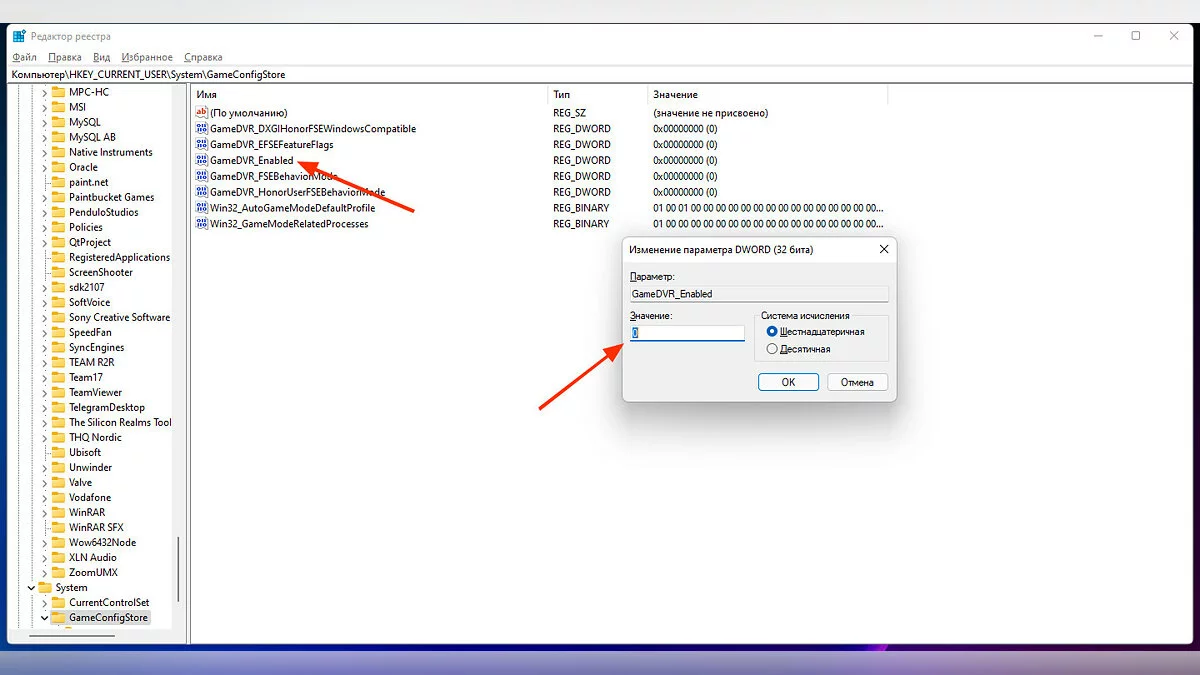 Нажмите клавиши «Win+R» и введите команду regedit, чтобы попасть в редактор реестра. Пройдите по ветке HKEY_CURRENT_USER\System\GameConfigStore и в параметре «GameDVR_Enabled» поставьте значение 0.
