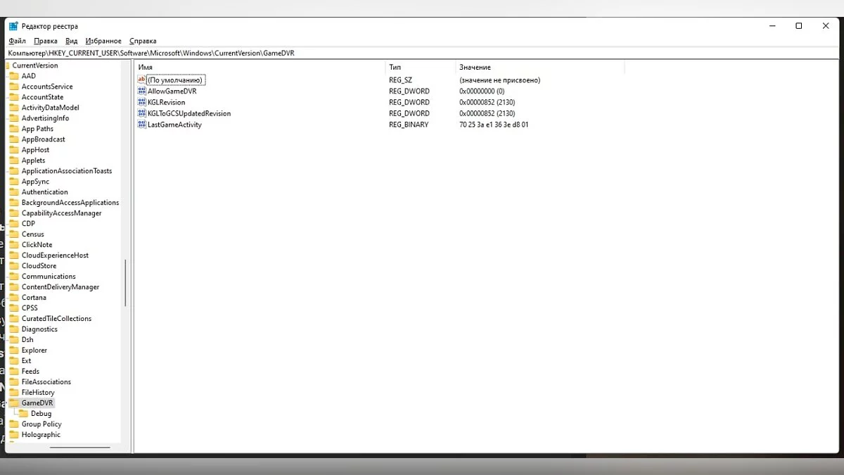 Затем, пройдите по ветке HKEY_CURRENT_USER\Software\Microsoft\Windows\CurrentVersion\GameDVR. Если раздела «GameDVR» нет — создайте его. В нем также сделайте параметр DWORD (32 бита), назовите его «AllowGameDVR» и задайте значение 0.