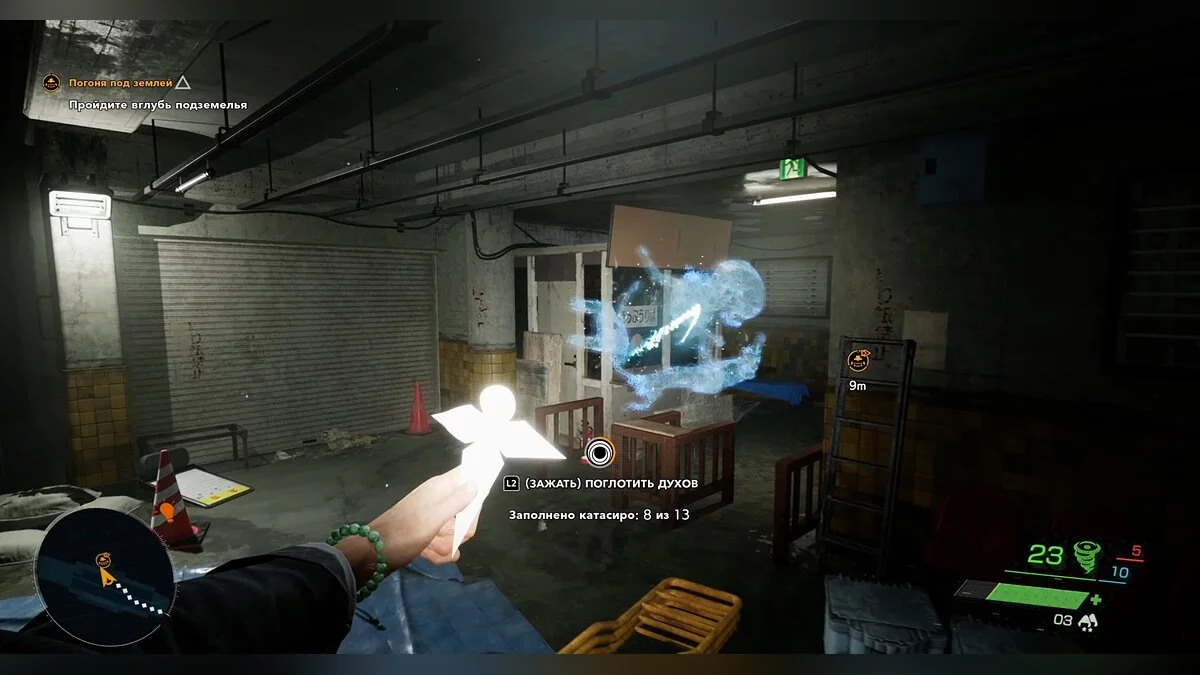 Двигаемся к следующему маркеру. Собака заметит демонов. Побеждаем врагов за короткий промежуток времени и спасаем духов с помощью катасиро.