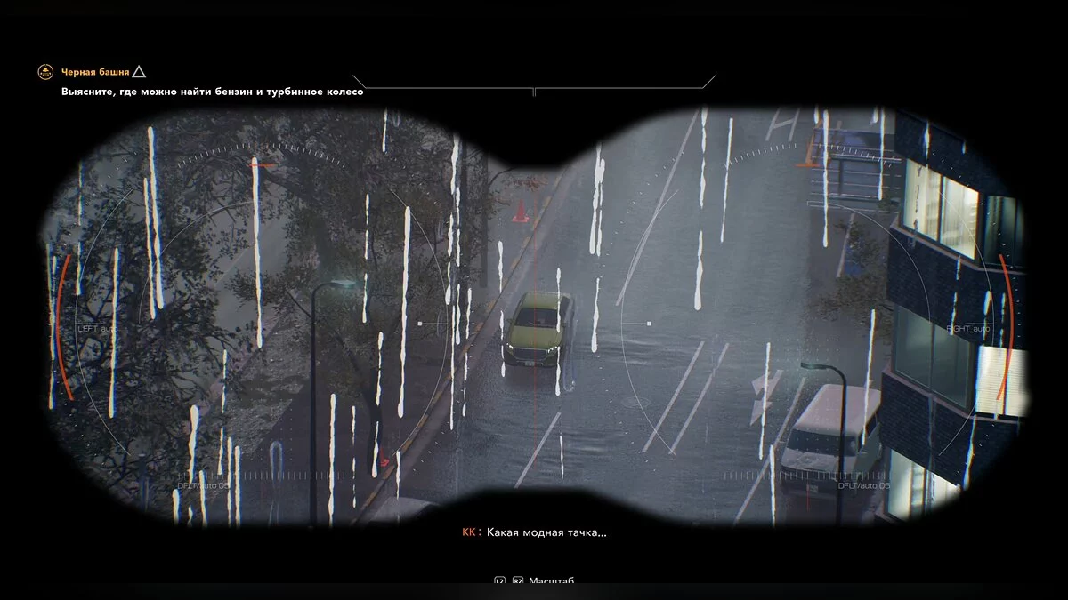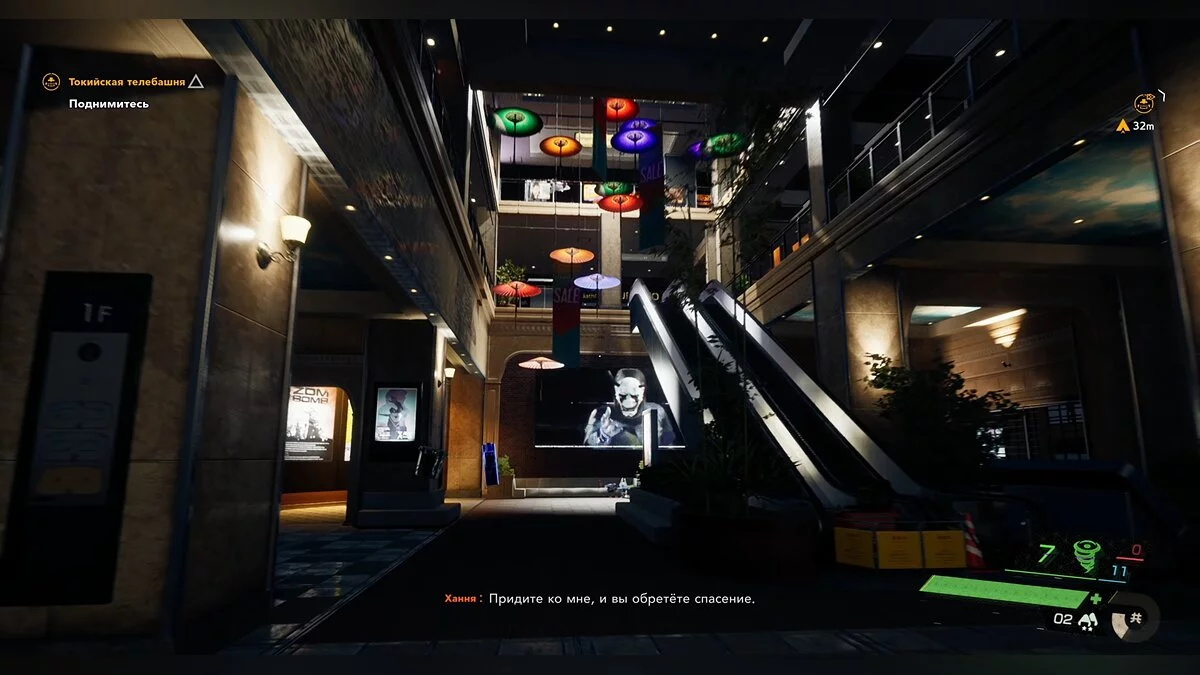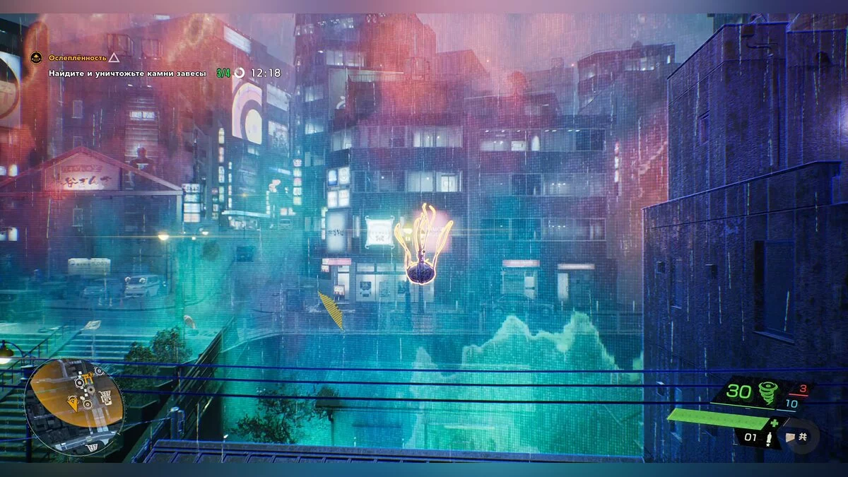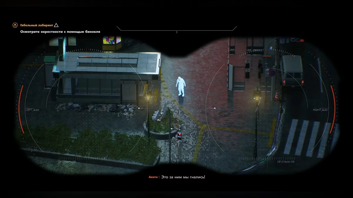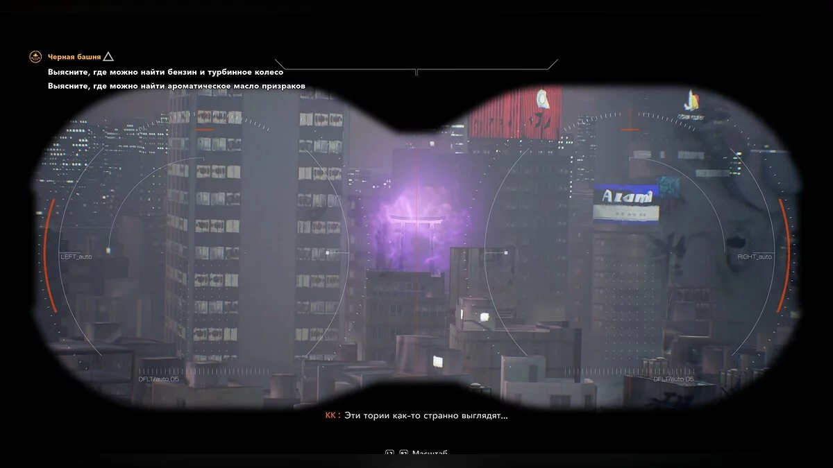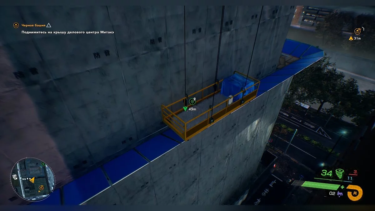 Следуем к указанной точке до делового центра Митака. Предварительно очищаем врата, чтобы открыть дорогу герою. Используем два подъёмника и активируем бинокль.