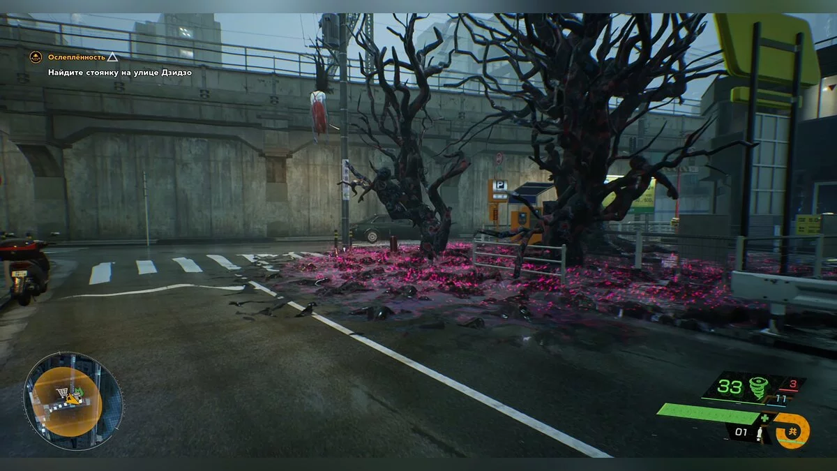Возвращаемся к будке и связываемся с Эдом. Поговорить с ним не получится. Двигаемся по маркеру на стоянку, расположенную на улице Дзидзо. Очищаем скверну и побеждаем сильного противника.