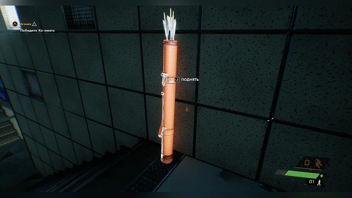 Следуем по прямой и стреляем из лука в предмет. Сразу же выбегаем из квартиры и поднимаемся выше на два этажа. Пробираемся через несколько помещений. Для этого используем приседания и прыжки.