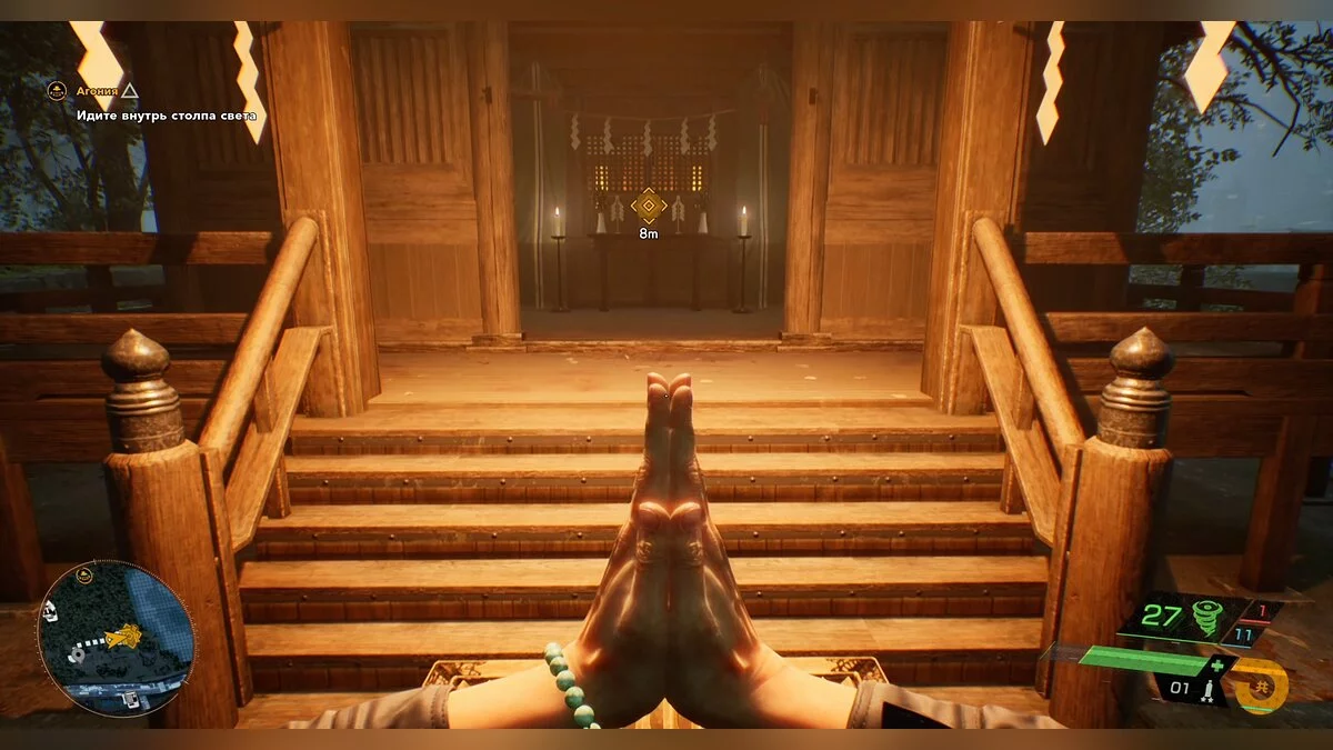 Очищаем святилище и осматриваем водную сферу для получения новых навыков. Выбираемся на улицу. Туман рассеится, поэтому беспроблемно добегаем до смотровой площадки Кагэриэ. Убиваем всех врагов и поднимаемся на крышу.