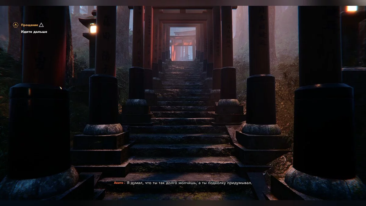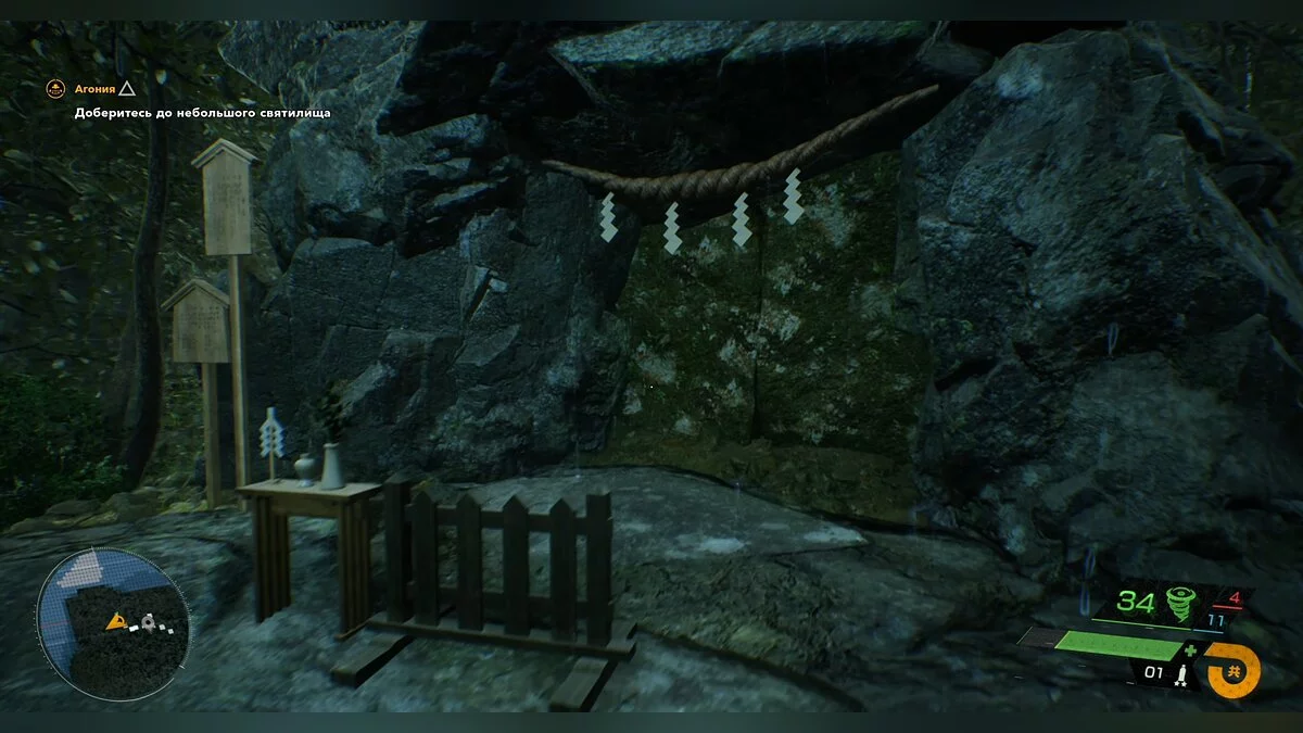 После кат-сцены сразу же очищаем тории и двигаемся к маркеру. Следующая цель находится на севере в закрытой зоне, поэтому придётся рассеять туман ещё в одном месте.