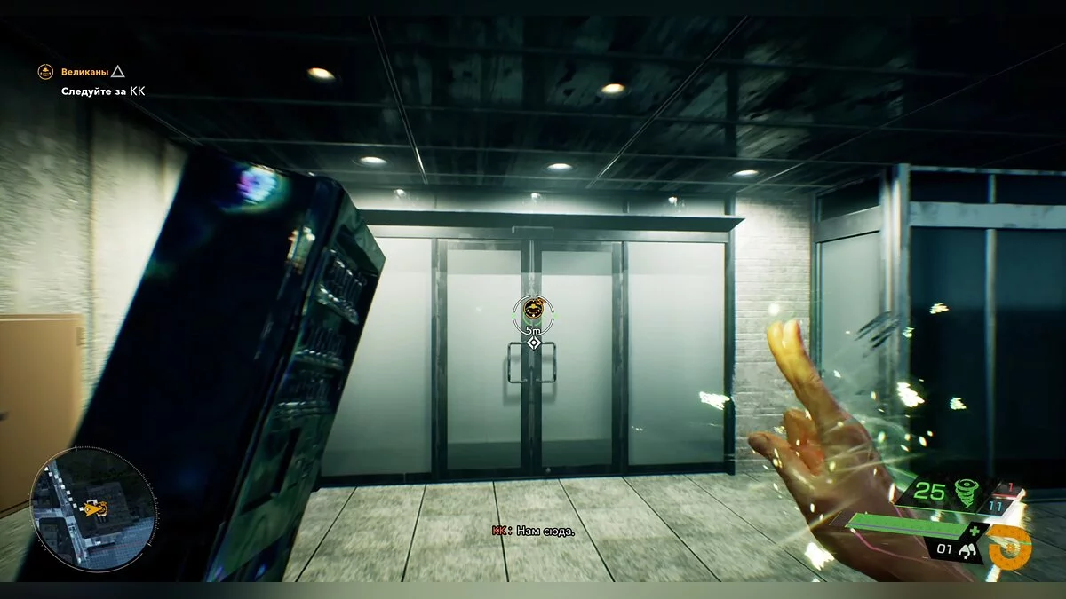 Поднимаемся по эскалатору на второй этаж. В конце коридора атакуем врага и вытаскиваем ядро. Следуем к маркеру.
